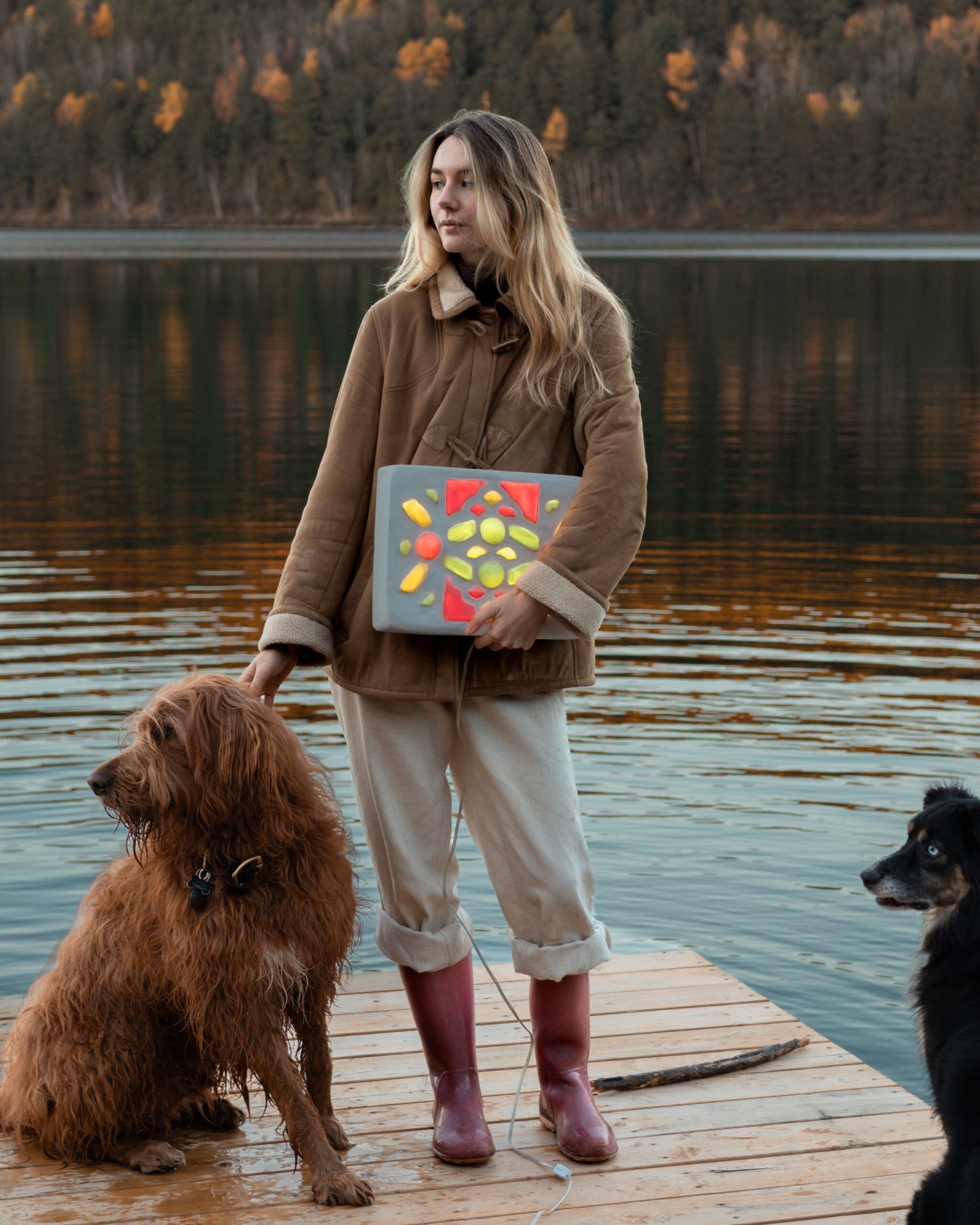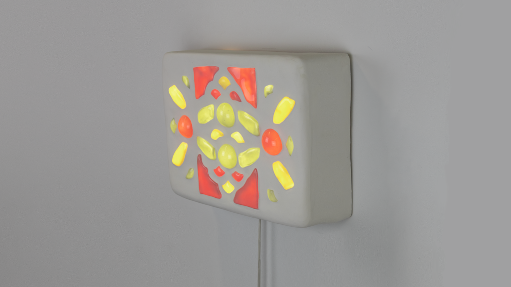 Sculpture lumineuse Porcelaine, ciment, pigments colorés, bois, DEL, composants électriques, 32 × 27 × 8 cm